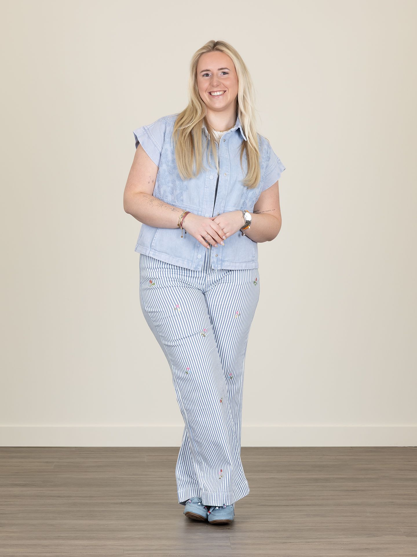 Dana is 1,67 m. zij draagt de broek in maat 42, de top en de gilets in maat M.