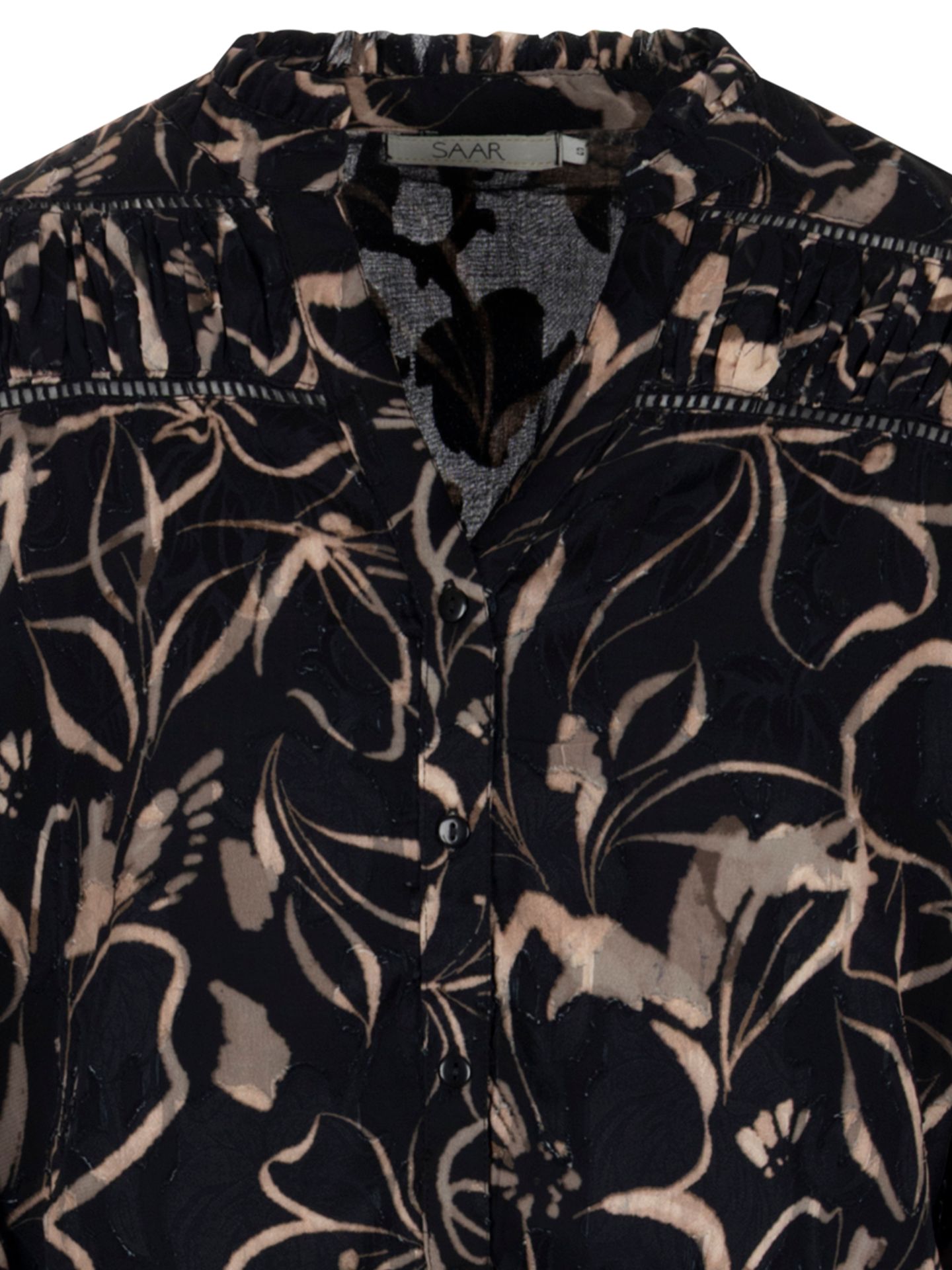 Deze blouse heeft een sierlijk bloemenmotief in de stof. De plooidetails op de schouders en het rimpelrandje langs de hals geven een speelse uitstraling. De blouse sluit met knoopjes en heeft lange mouwen met elastische manchetten, wat zorgt voor een comfortabele pasvorm.