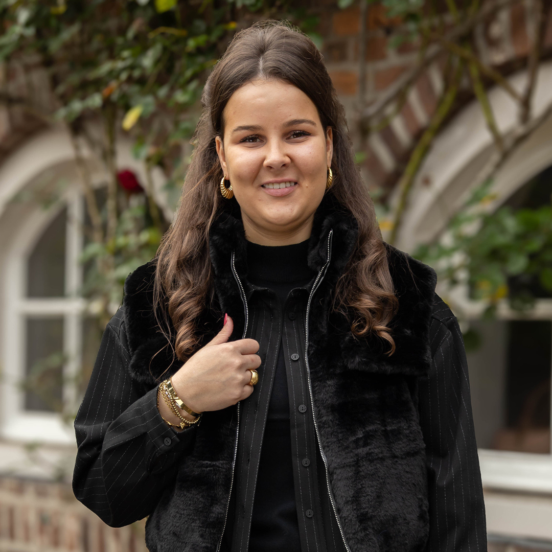 Imke is 1.78 m en draagt haar kleding voornamelijk in maat S/M.