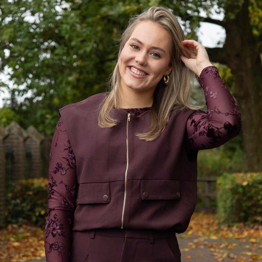 Imke is 1.78 m en draagt de jas in maat XS, het gilet in maat S, het t-shirt en broek in maat M.