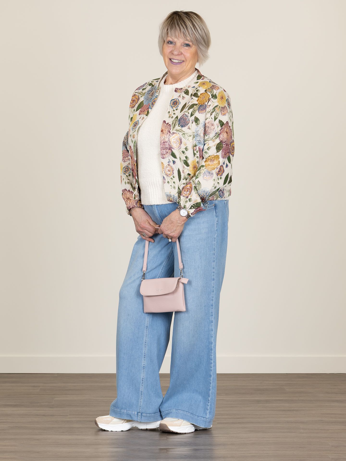 Els is 1.73 m. zij draagt de pull-over in maat XXL, de blazer in maat L en de jeans in maat 40/32.
