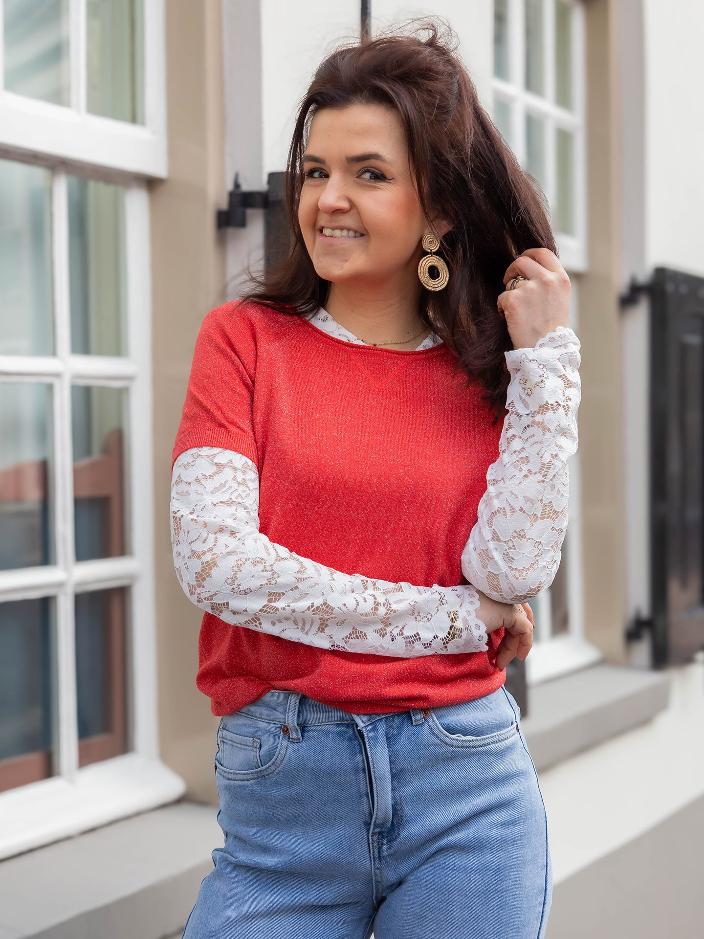 Semmy is 1,70 m. zij draagt de jeans in maat 36 en de trui in maat XS/S.