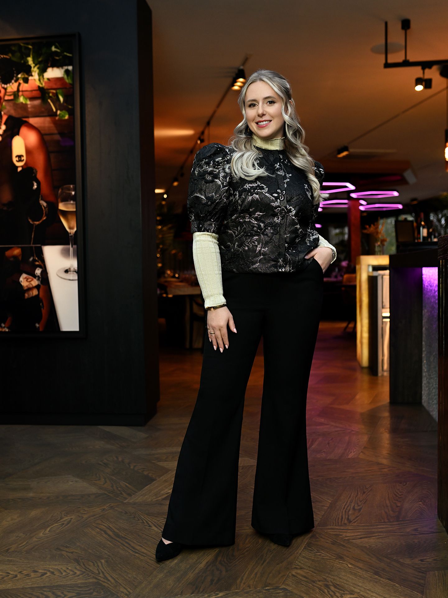 Dana is 1,67 m. zij draagt de broek in maat 42, de trui in maat M/L en de blazer in maat M.