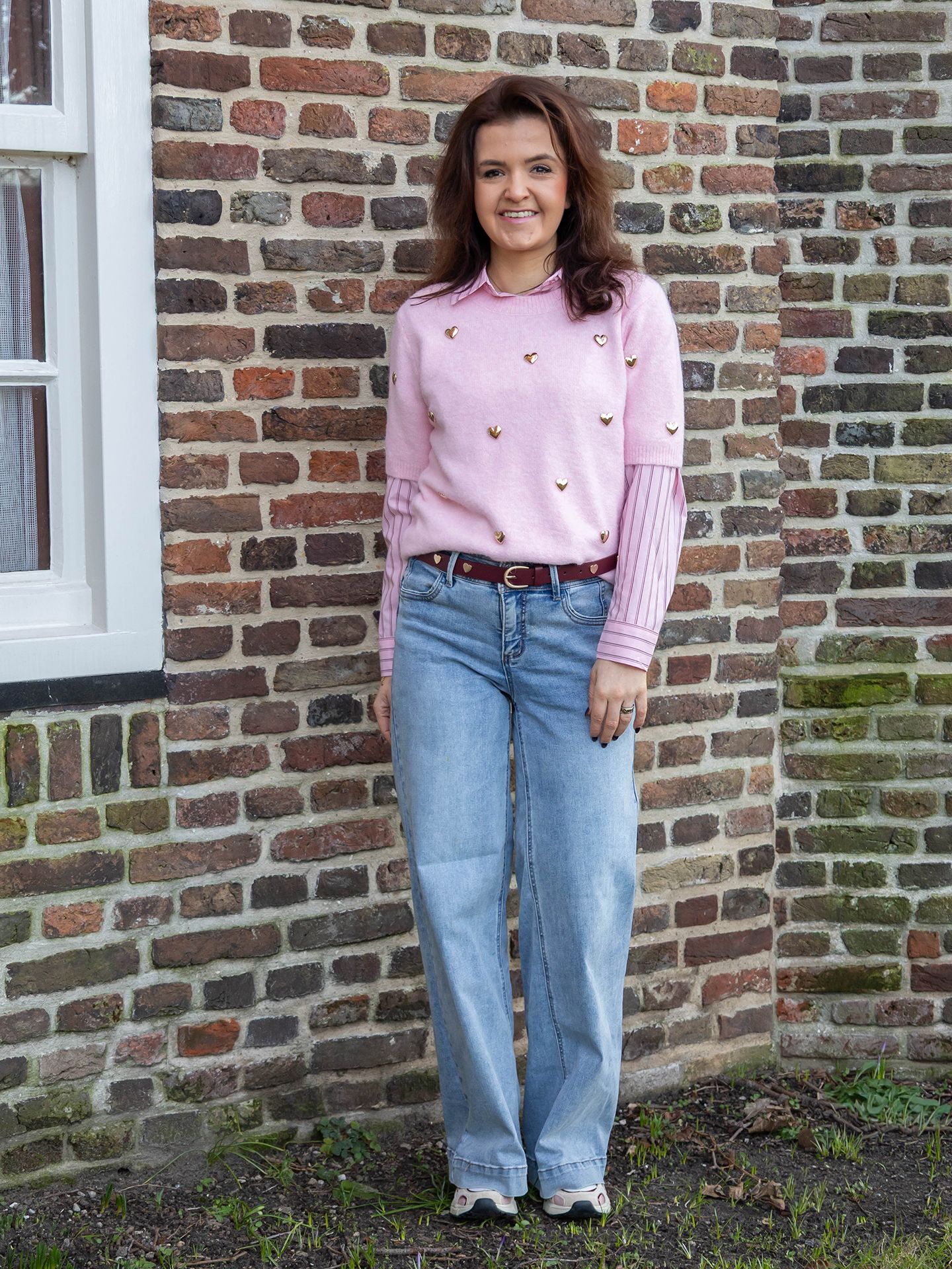 Semmy is 1,70 m. zij draagt de jeans in maat 27/32, de blouse in maat M en de trui is one size.