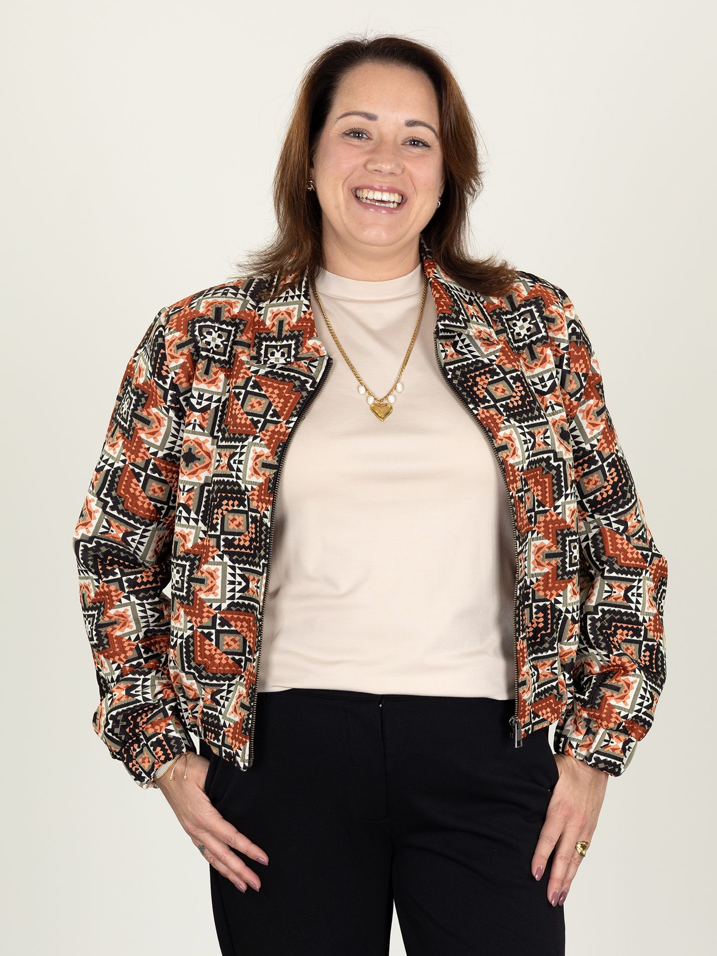 Stephanie is 1.68 m. en draagt de blazer in maat 40 en het t-shirt en broek in maat L.