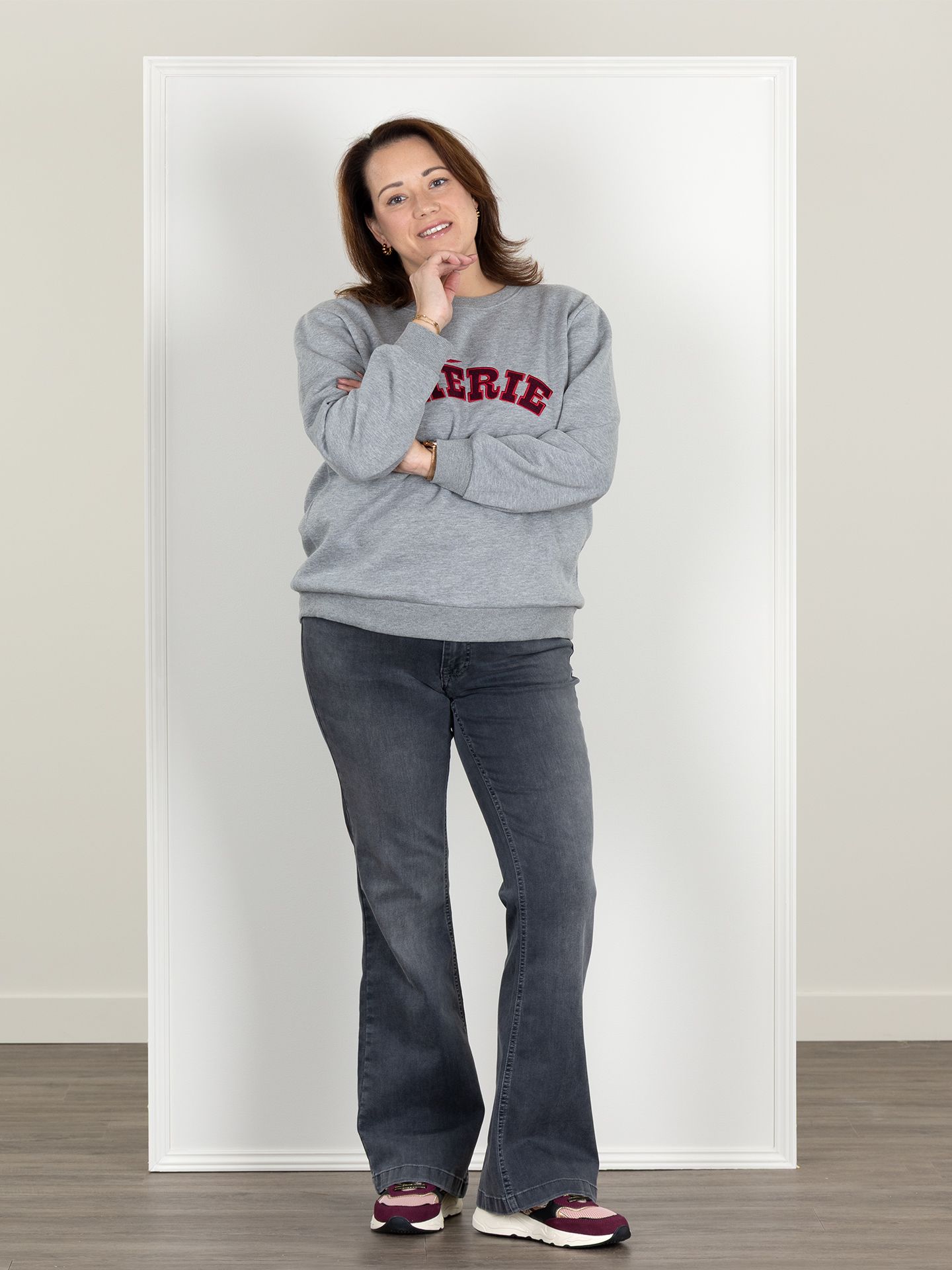 Stephanie is 1.68 m. zij draagt de jeans in maat 40/32, de jas en trui in maat L.