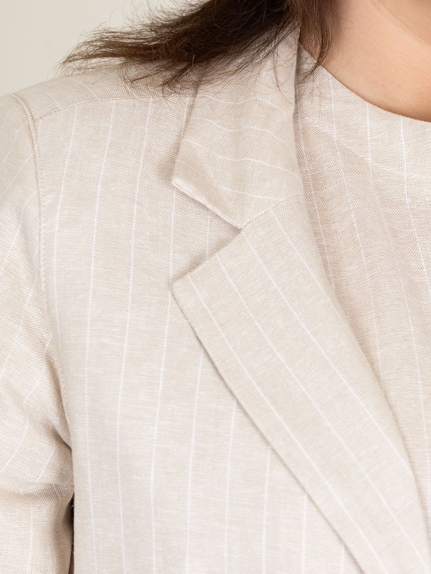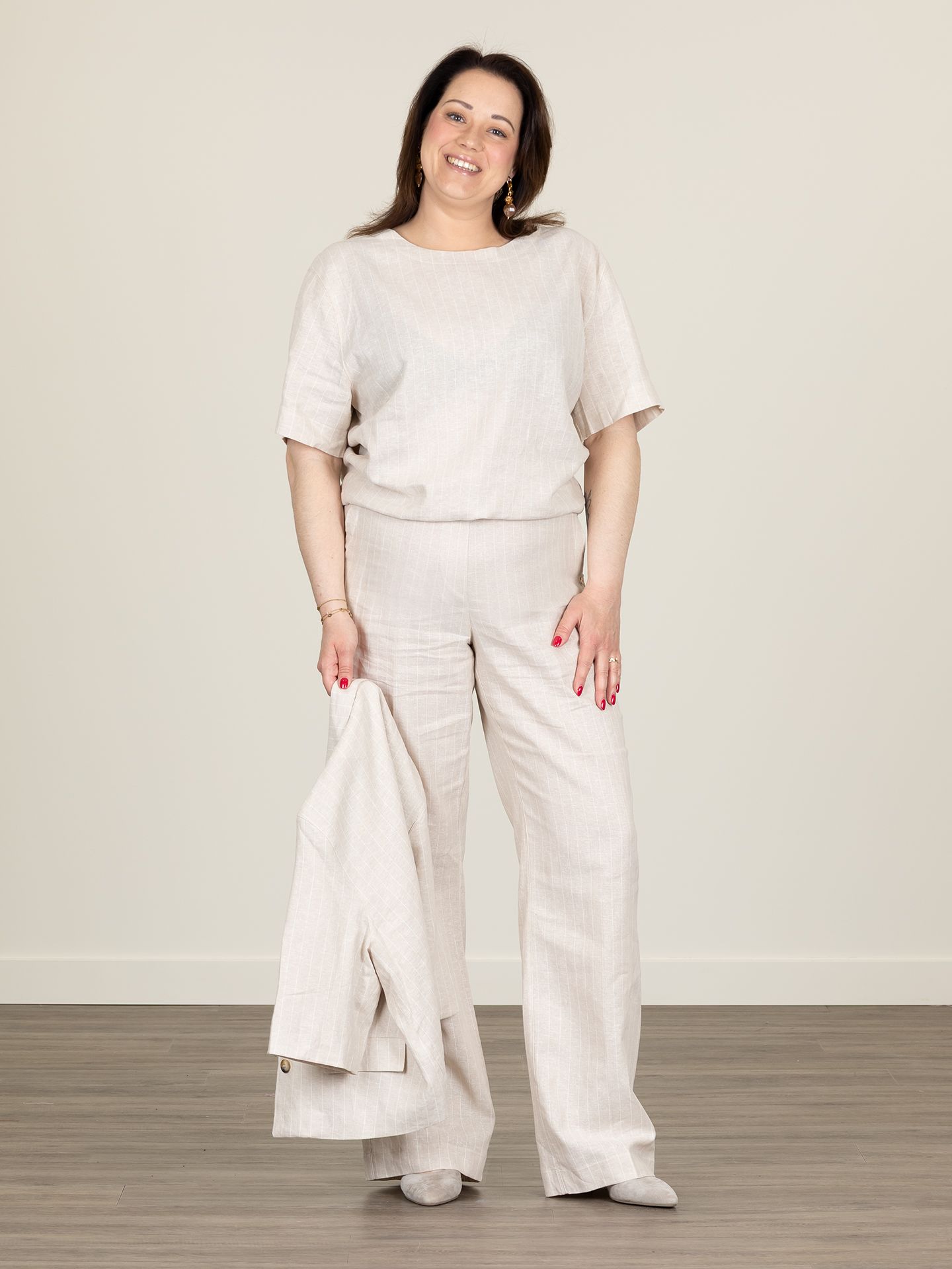 Stephanie is 1.68 m. zij draagt de blouse in maat XL, de blazer in maat L en de broek in maat 40/33.