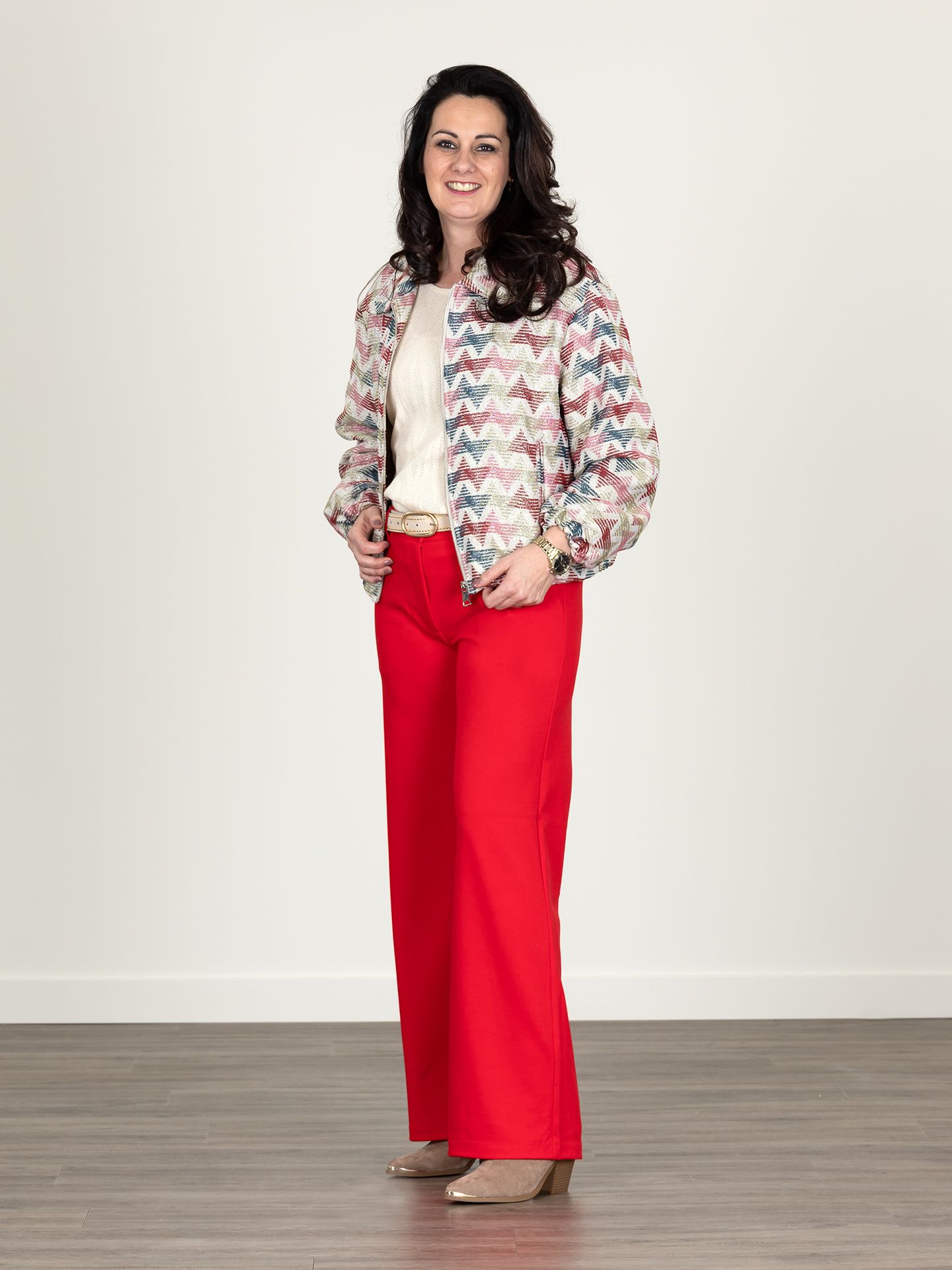 Susan is 1.73 m. zij draagt het t-shirt in maat S, de blazer en broek in maat M.