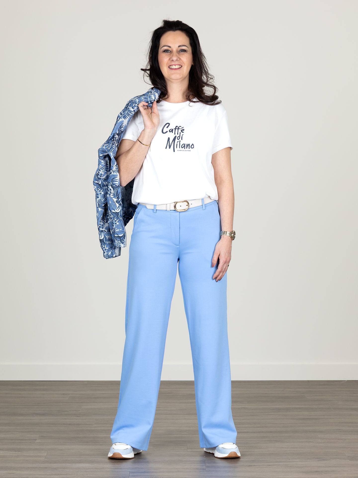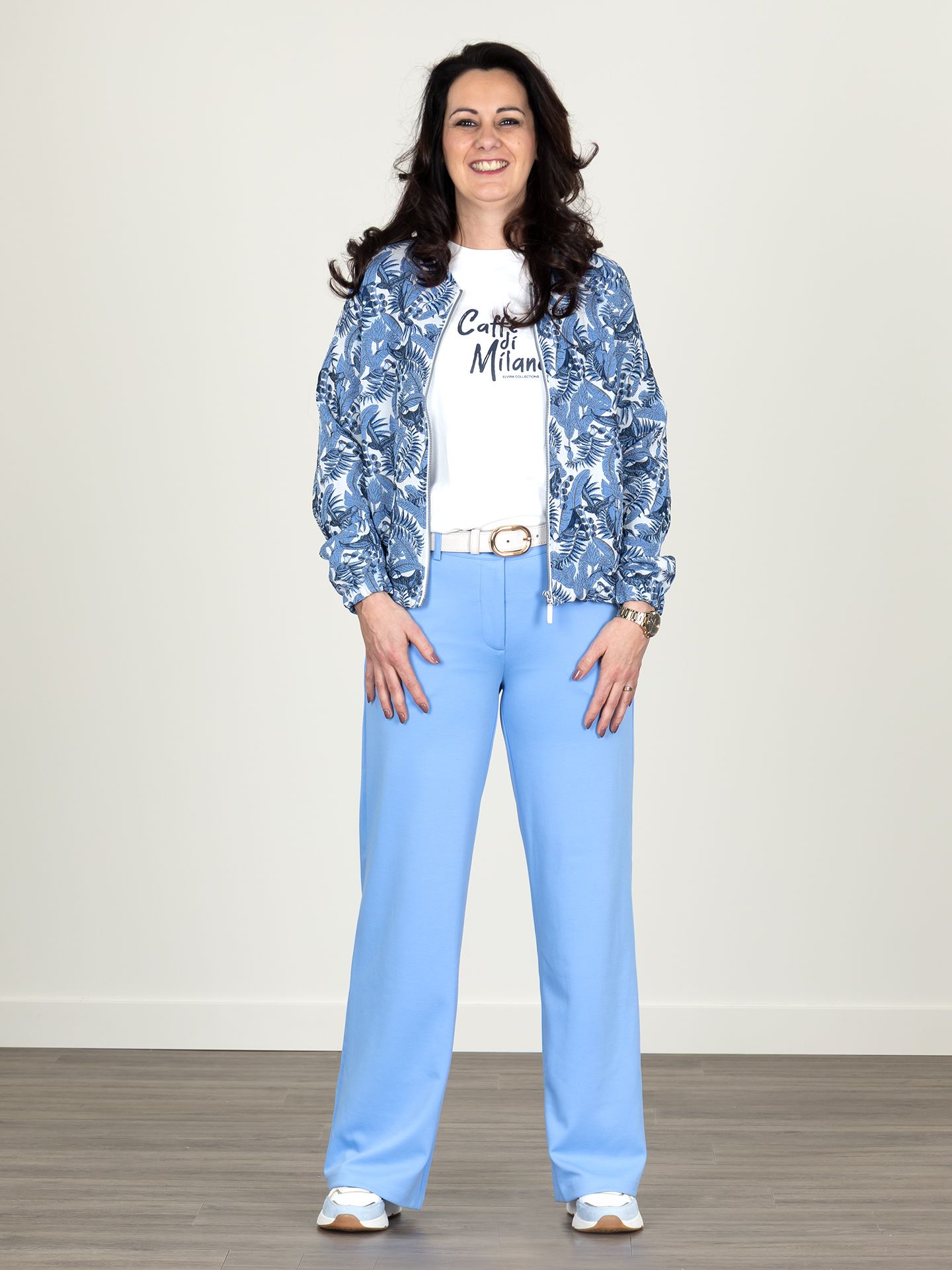 Susan is 1.73 m. zij draagt het t-shirt in maat M, de broek en blazer in maat S.