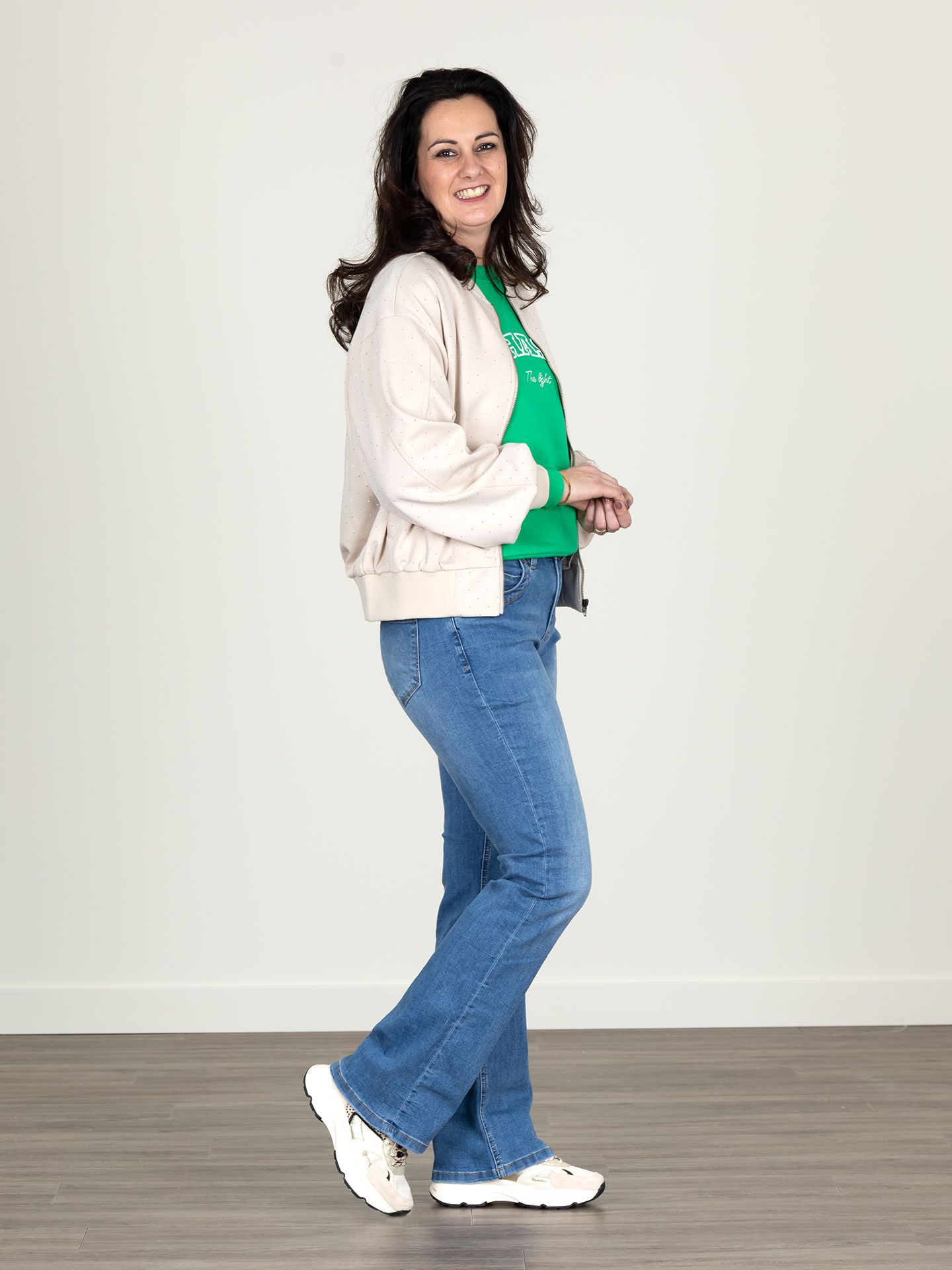 Susan is 1.73 m. zij draagt de jeans in maat 38/33, de sweater en vest in maat S.