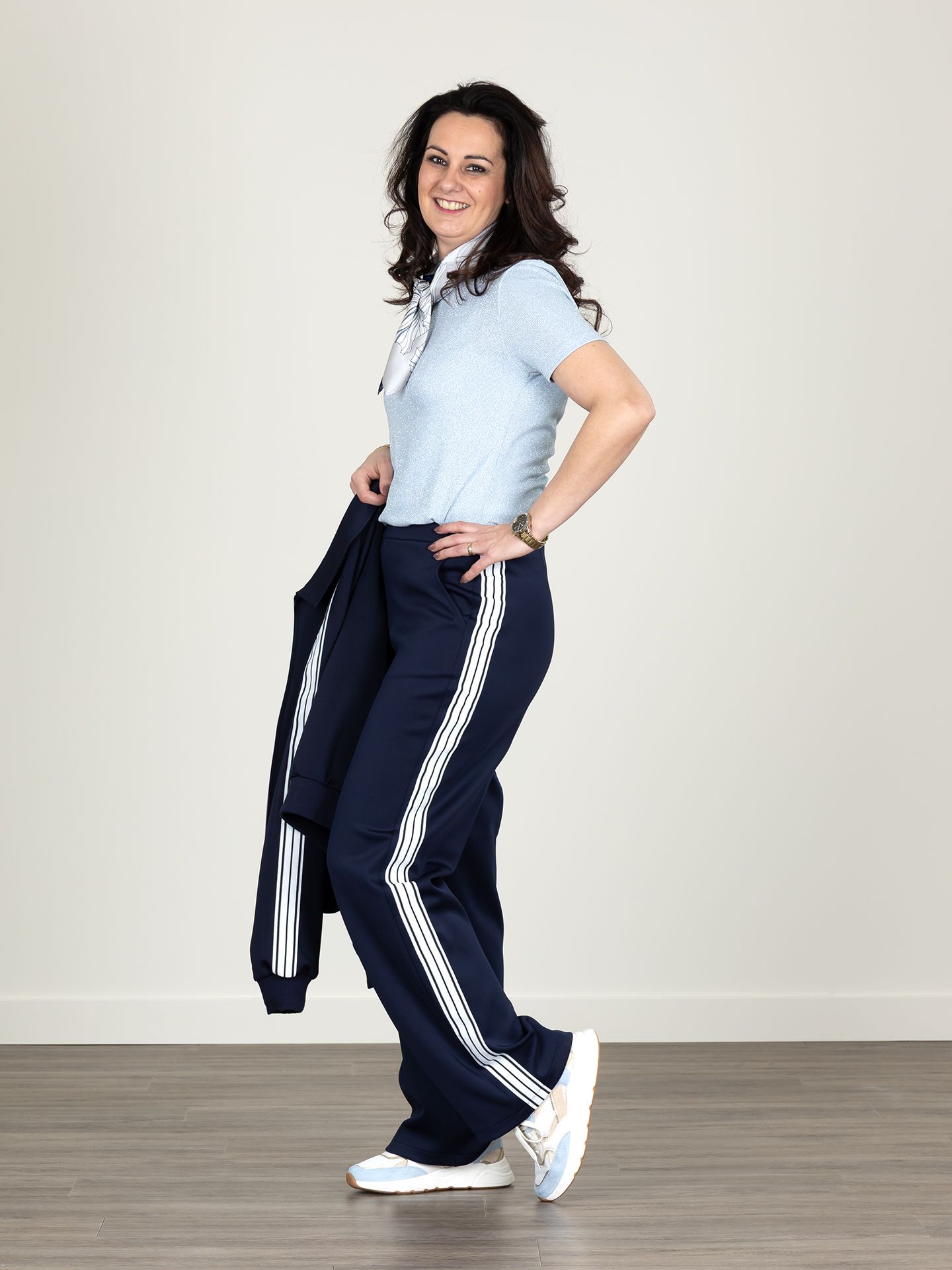 Susan is 1.73 m. zij draagt het t-shirt in maat M, de blazer en broek in maat 36.