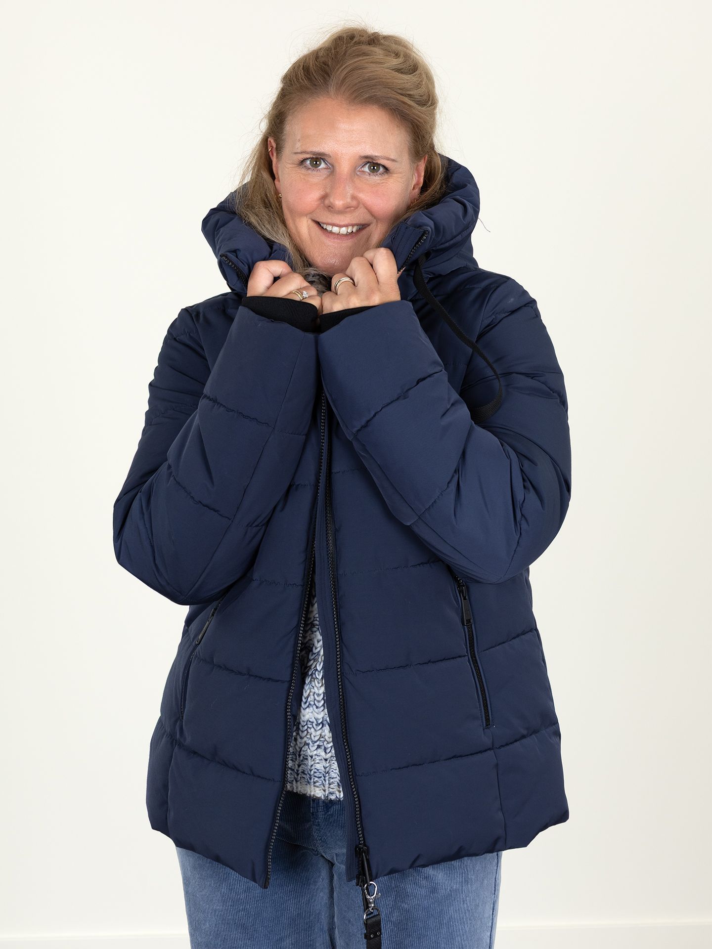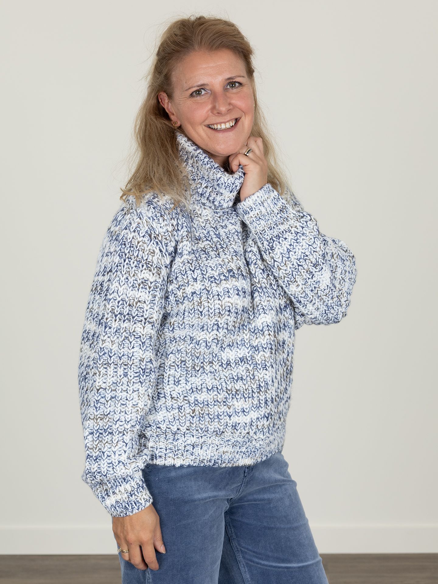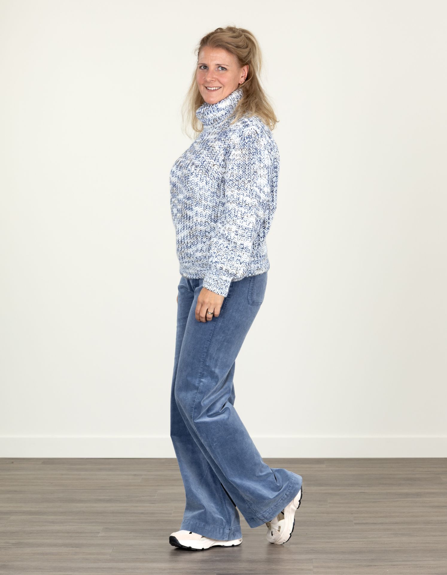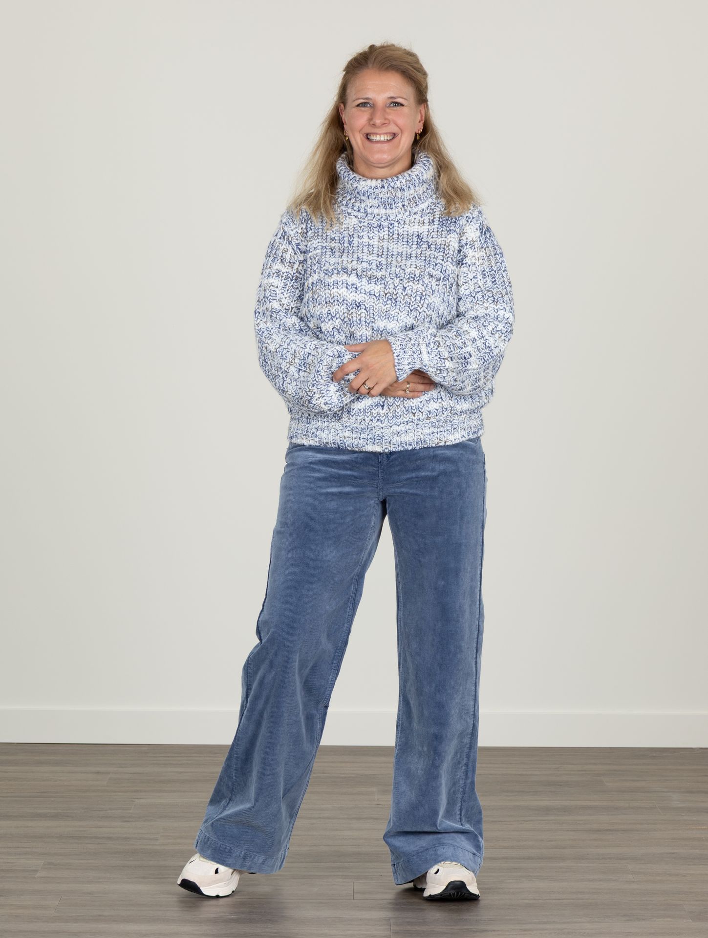 Trudy is 1.64 m. en draagt de jas in maat L, de trui in maat M en de broek in maat 38.